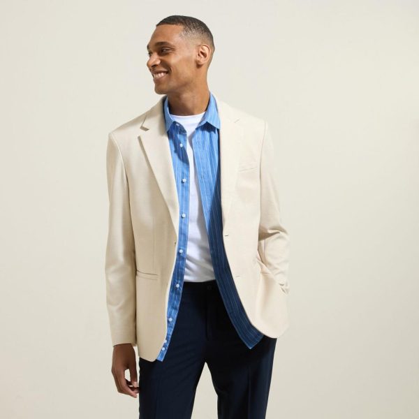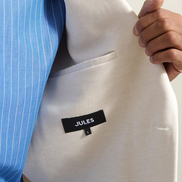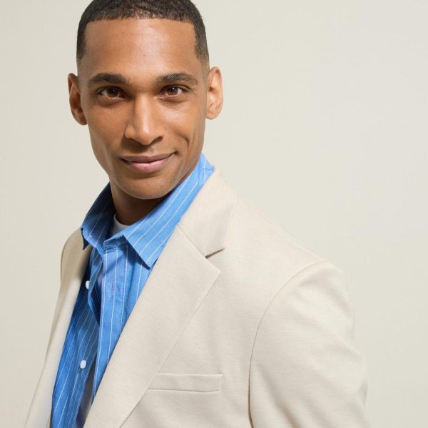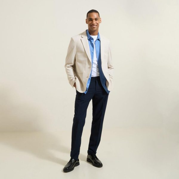 Cette veste de costume s’associe parfaitement avec la chemise à rayures et le pantalon de costume pour un look élégant et moderne. Les chaussures habillées complètent la tenue avec une touche sophistiquée.